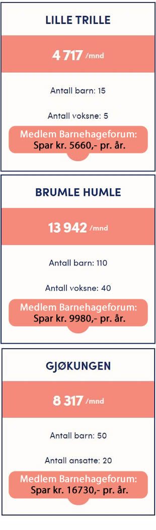 Kolibrix jobber effektivt og mye går av seg selv, dette gir mindre arbeid for både barnehage og regnskapsfører som igjen gir en hyggelige pris. Du får en fast månedspris som inkluderer timer hos regnskapsfører, alle bilag, årsregnskap, rådgivning og support.